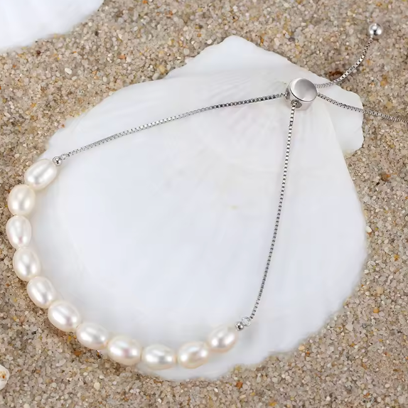 This Evelena Bracelet features a delicate chain crafted from 925 sterling silver and adorned with lustrous freshwater pearls. Its classic and fine design adds elegance to any outfit. With its timeless appeal, this bracelet is a must-have for any collection.
